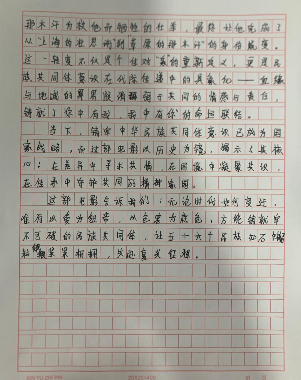 光影落幕,余韵悠长。观影《海的尽头是草原》后,同学们沉浸于跨越山海的温情故事,以细腻笔触、真挚情感,将心中所感凝于笔端。字里行间流淌着对民族团结的深刻理解,诉说着对人间大爱的动人诠释。现遴选部分优秀作品予以展示: