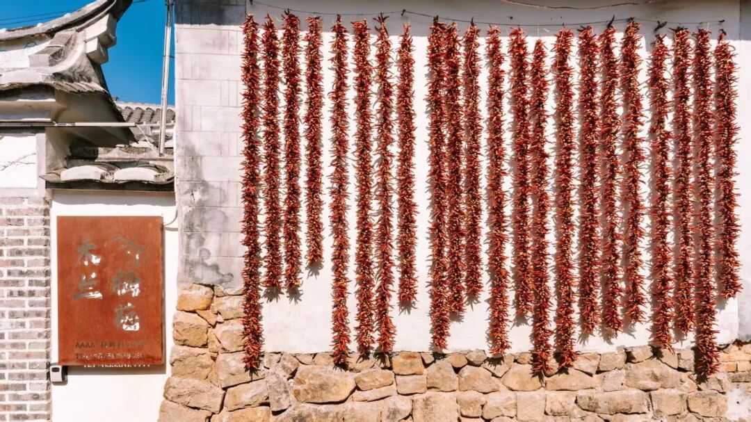 此时恰逢桂峰村的晒秋节,随处可见丰收的盛况:辣椒、玉米等农作物被整整齐齐地摆在院前和屋顶上,五彩缤纷的农作物与青黛色的古建筑产生碰撞,整个村庄都是五彩缤纷的丰收果实,处处尽显秋收风情。