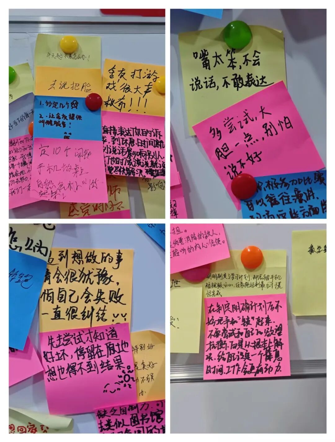 活动现场设置了专属“解忧角”,工作人员提前准备好黄、橙、粉、蓝四种颜色的便利贴,并明确规则:同学们需将自己在学习、生活、人际关系等方面遇到的“烦恼”,用黄色或橘色便利贴清晰写下。