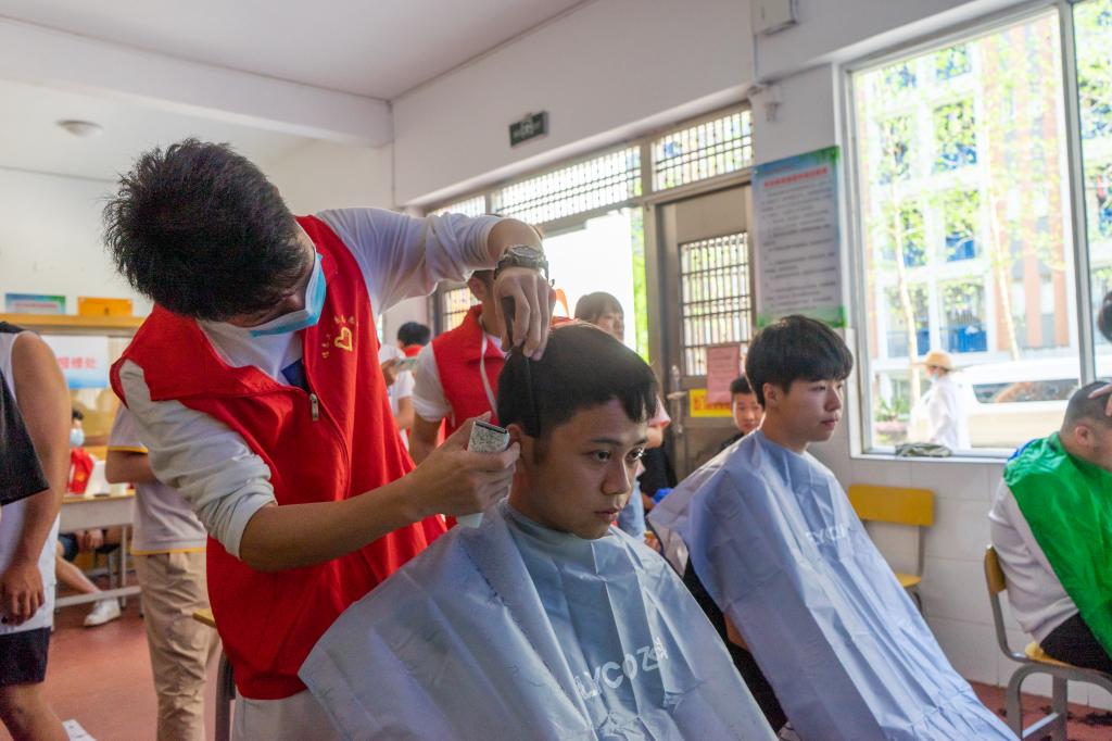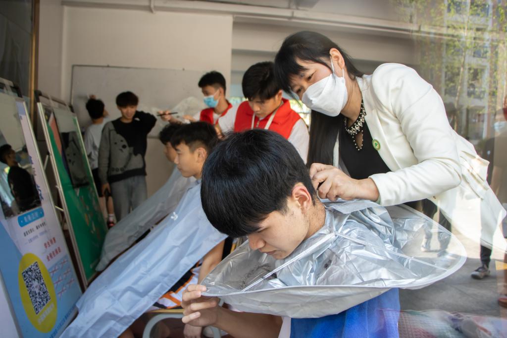 活动现场火热而有序,每个人都戴着口罩保持距离等着被“叫号”,九位同学化身为“tony”老师。他们面带微笑,满怀热情地招呼同学们,根据同学们的修剪需求,为他们提供细致入微的服务。只见“tony”老师们挥舞着手中的剪刀推子,手指翻飞,动作娴熟,按住需要剪的部位,在突出的头发上轻轻一划,一撮头发就缓缓落下,一推一剪之间满满的都是用心。