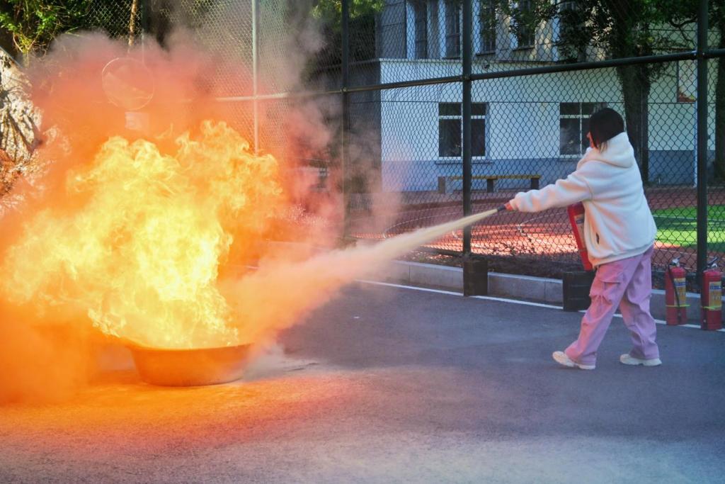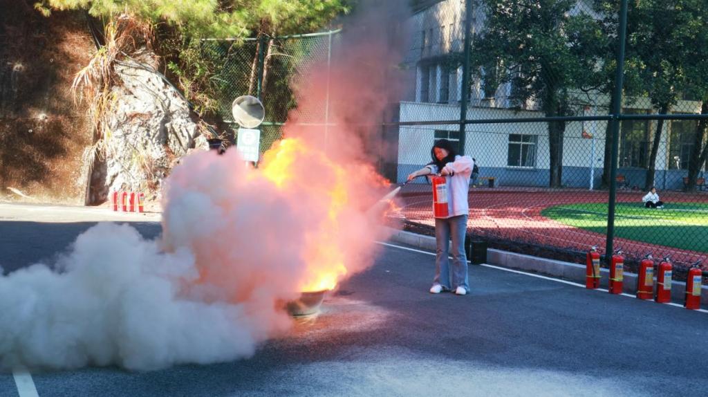 总结反思,安全铭记:在操场集合完毕后,消防工作人员对学生们的表现给予了高度的赞扬。他强调,安全永远是第一位的,本次消防演练,就是为了让大家在面对真正的火灾时,能够保持冷静,同时也能提高师生的安全意识和应急自救能力。紧接着,在经过消防工作人员的讲解后,学生们掌握了如何使用灭火器。他们提起灭火器,拔掉保险销,握住喷嘴,对准火源的根部,然后用力按下压把。白色的粉末如同雪花般从灭火器中喷涌而出,与火焰展开了激烈的对抗。