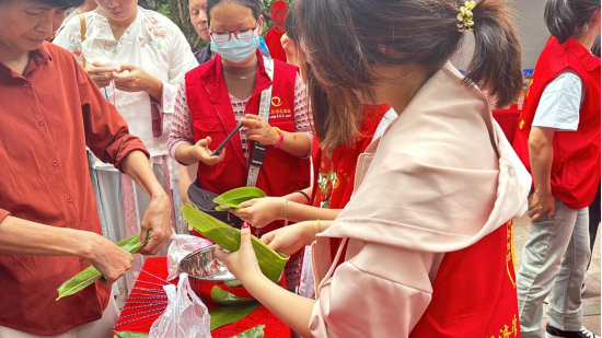 5月31日上午八点,经济管理系青年先锋队的志愿者就已经到达杨真公园开始了他们的志愿活动。在活动正式开始前,青年先锋队的志愿者合理分配在杨真公园的各个角落,或穿梭在人群中分发活动传单,或在汉服展示、沐兰汤、点雄黄、系彩绳、制香囊、射五毒、饮午时茶等体验活动区热情耐心地引导居民参与,细致讲解每项习俗的渊源与寓意,似传递文化薪火的使者;或在旱地龙舟、包粽子比赛等端午节竞技活动区,耐心引导群众参赛,积极协助准备道具,为选手们加油鼓劲,那一声声充满激情的呐喊,似夏日里的阵阵清风,吹散了参赛者的紧张,让欢声笑语在活动区上空久久回荡。