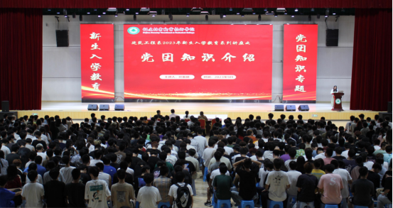 本网讯/为引导广大学生坚定理想信念,提升我系新生对党务与团学知识的认识,提高入团入党的积极性,帮助新生更好地了解党团知识,增强团员意识,引导新生积极向党组织、团组织靠拢,2023 年 9 月22日晚上在江南体育馆召开党团知识介绍。本次讲座由建筑工程系专职组织员叶新颖老师讲授,新生辅导员以及全体2023级新生(含20级五年专)参加,建筑工程系新生辅导员丁雨涵老师主持活动。
