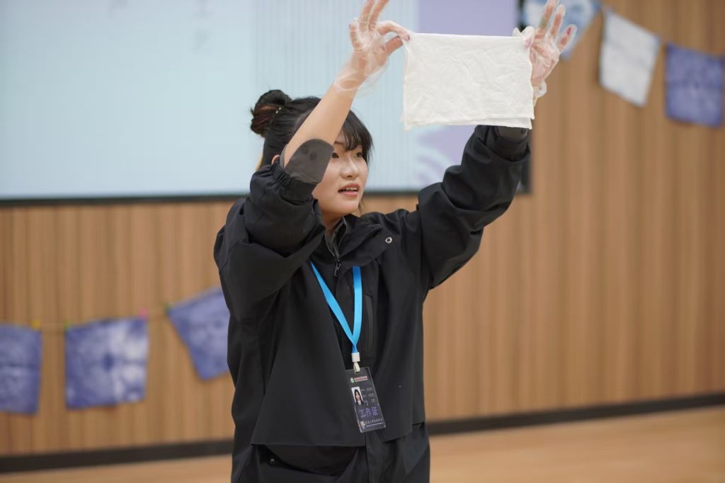 随后,同学们暂时放下日常课业琐事,集中精力投入创作:从选择扎法、设计图案,到调配染料,再通过折叠、捆绑、染色等一系列细致步骤,大家巧用不同的捆扎方式搭配丰富色彩组合,尽情发挥想象力与创造力,亲手制作属于自己的独一无二的“布上花”。