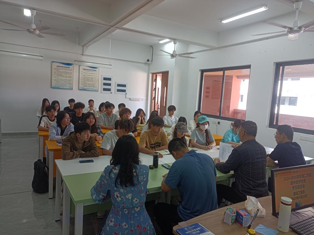 本网讯/为进一步加强学院师德师风建设,规范教师的教学工作,深入了解教学情况,进一步提升教学质量,以及本学期开学以来各项教学工作的运行情况,2025年4月29日,建筑工程系于建工楼实训室505成功召开2024-2025学年第二学期期中教学检查学生座谈会。建筑工程系主任彭忠伟、副主任张李平、系教务科科长廖坤阳、环境工程教研室主任陈燕、建筑工程教研室主任陈龙以及各年级、专业学生代表齐聚一堂,共话教学发展,本次会议由廖坤阳主持。