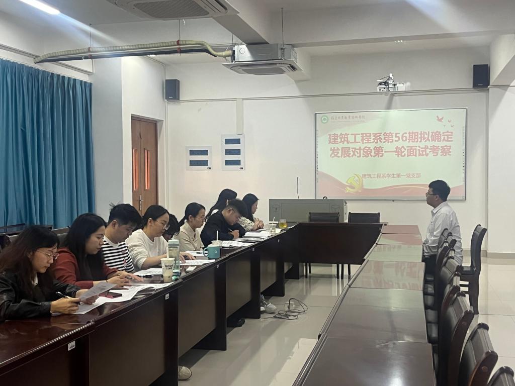 面试部分由建筑工程系学生第一党支部教师党员及56期入党积极分子辅导员担任面试的评委,着重对入党积极分子的政治理论学习情况、时事政治、入党动机、入党规划等方面进行考察,通过与入党积极分子们的互动交流,老师们从中了解他们的思想状况和现实表现,也从现存的问题中提出了宝贵的意见和建议,希望他们能够更加深刻地理解党的性质和使命,在今后的学习和工作中继续以青年之力担起应尽的责任和义务,不断追求进步、完善自我。