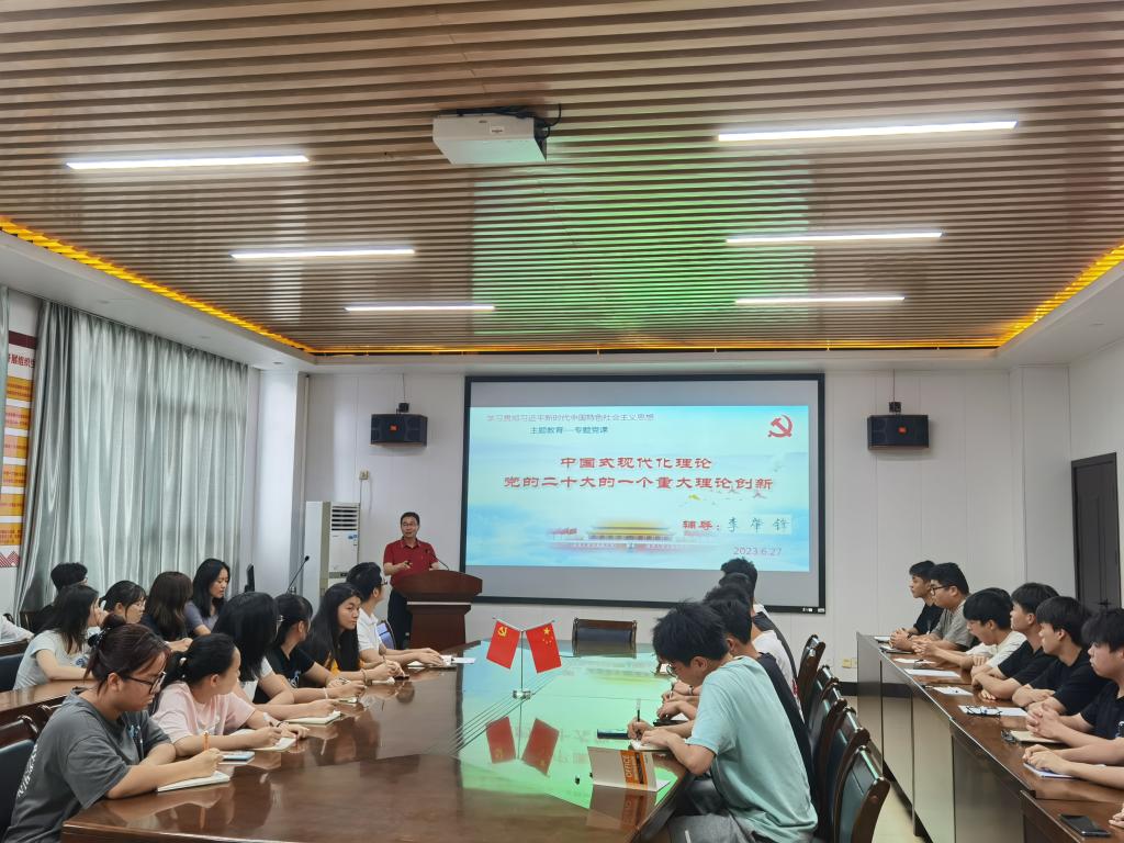 为深入学习贯彻党的二十大精神,扎实开展学习贯彻习近平新时代中国特色社会主义思想主题教育,教育引导学生深刻理解和把握中国式现代化,6月27日下午,李肇锋副院长在林学系会议室为联系班级学生作题为《中国式现代化理论——党的二十大的一个重大理论创新》专题党课,系专职组织员罗勇、班级辅导员樊寿娜、林业技术2202班全体同学参加。