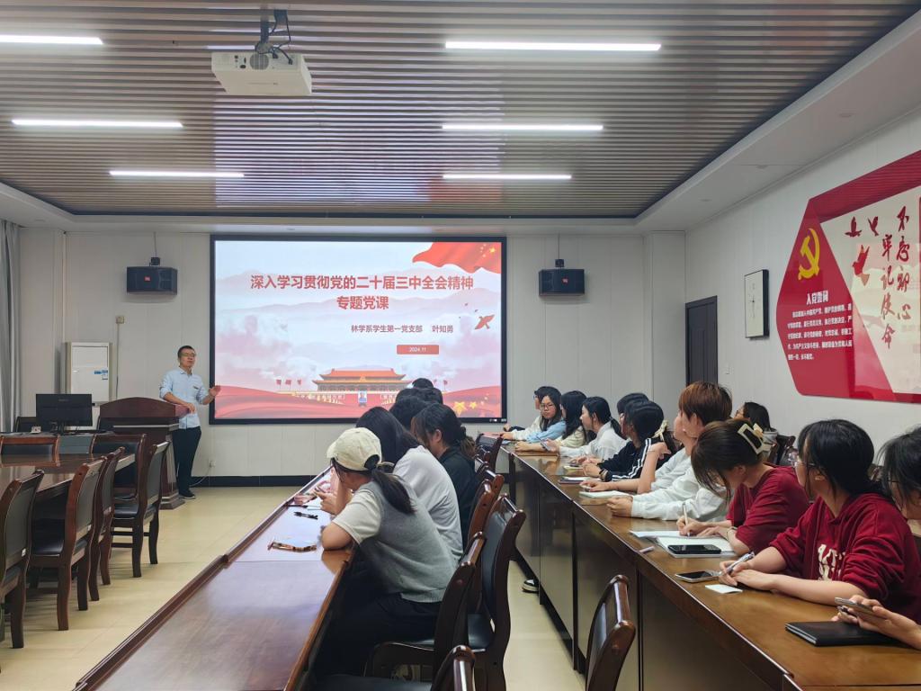 为深入学习贯彻党的二十届三中全会精神,推动会议精神落地生根,强化党支部建设。2024年11月11日,林学系学生第一党支部开展“深入学习贯彻党的二十届三中全会精神”专题党课,此次党课由支部书记叶知勇老师主讲,支部全体同学参与。