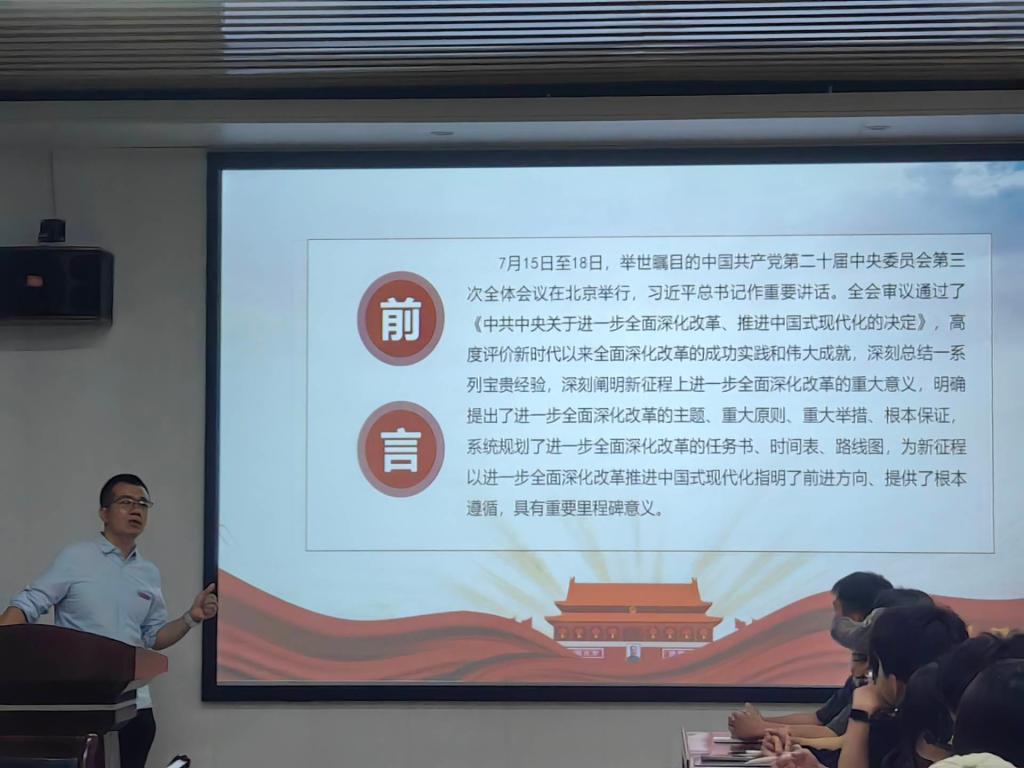 党课中,叶知勇老师从党的二十届三中全会召开的背景与意义、深刻领会进一步全面深化改革的重要性和必要性、准确把握进一步全面深化改革的总体要求和重大原则等方面进行了阐述。