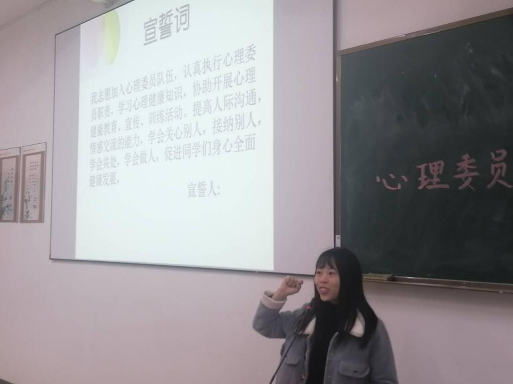 第一期——心理委员工作实务从心理委员设置的背景、大学生心理健康标准、心理委员具备的心理素质、心理委员工作内容以及心理委员月报表填写五个方面进行培训。本次培训讲座增设心理委员宣誓环节,心理委员志愿加入心理健康工作队伍,认真执行心理委员职责,学习心理健康知识,学会关心别人,接纳别人,促进同学身心全面健康发展。