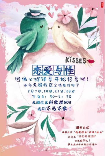 1.恋爱与性团体心理辅导。2022年3月7日至3月28日组织开展为期四次的恋爱与性团体心理辅导。青年大学生性生理已发育成熟,性意识增强,他们渴望友谊,向往异性交往,渴望爱情,恋爱已成为普遍现象。他们在性心理发展与谈恋爱的过程中也有不少烦恼与困惑,需要高质量的心理指导。恋爱与性团体心理辅导就是帮助大学生正确了解性科学知识,做好爱的心理准备,学会爱的艺术。
