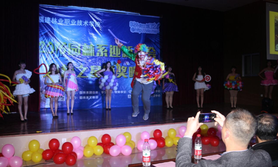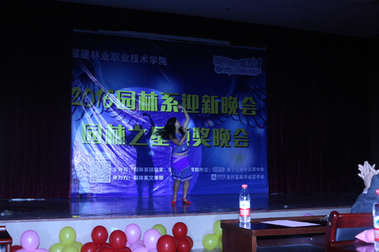 7点30分整,晚会在动感十足的爵士舞中拉开了序幕。银色灯光下这群舞者活力四射的表演,为晚会的成功举办营造了热烈的气势。晚会节目十分丰富,歌曲、小品、魔术气球秀、民族舞蹈、古筝弹唱、话剧等一一呈现在观众眼前。三位即将参加顶岗实习的毕业生呈上的《致光阴》串烧歌曲带领我们回想过去的美好时光,光阴似箭,时光如梭;民族舞蹈《佤族甩发舞》配合精彩的多媒体展示,让大家领略到中华灿烂的民族文化;精彩的《魔术气球秀,I SO YOU》更是让现场的气势达到了高潮。整场晚会穿插进行着“园林之星”的颁奖环节,包括技能之星、学习之星、创业之星、体育之星、文艺之星、服务之星、自强之星、道德之星等共14名同学获得此殊荣。这是园林系学工组举办的首届“园林之星”评选活动,通过学生自愿申报、班级推荐、组织评审等环节层层推荐、选拔出来的,充分展示了园林系学生积极进取、拼博奋进的正能量。院党委副书记陈洪尧老师、园林系主任黄勤坚老师、图书馆副馆长黄华明老师和园林系党总支副书记陈剑勇老师为获奖者颁奖。