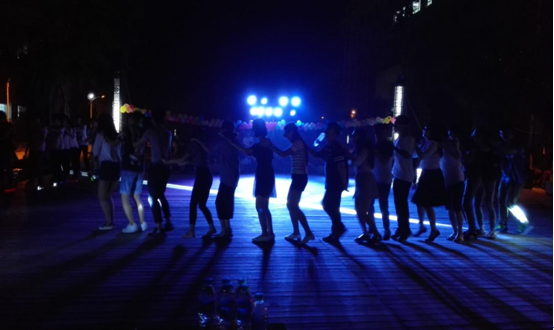 虽然舞会在晚上19:30才正式开始,但19点时现场氛围已浓,还未吃晚饭的工作人员还在紧张地进行场地的布置,调试设备;而已经到场的同学则有说有笑,兴奋地等待舞会地开始。19点30分,学院five乐队献上了精彩的开场表演,舞会正式拉开帷幕。现场的气氛逐渐升温,欢乐与激情洋溢在会场上。在时明时暗的灯光下,开始还有些拘束的同学们,都开始了放松的交流和互动。随后,在爵士舞队的热舞使现场气氛达到了一个小高潮。在舞会的活动过程中,男女同学配合默契,进行了很好的互动。随着熟悉的《兔子舞》音乐渐渐响起,现场工作人员跟着动感的节奏排起长队。在一旁的同学们也被活泼的气氛所带动,纷纷加入他们的行列,再次将舞会推到高潮。不知不觉中舞会已经接近了尾声,在最终的抽奖环节与串烧歌曲后,舞会在同学们的喝彩和掌声中为舞会落下了帷幕。