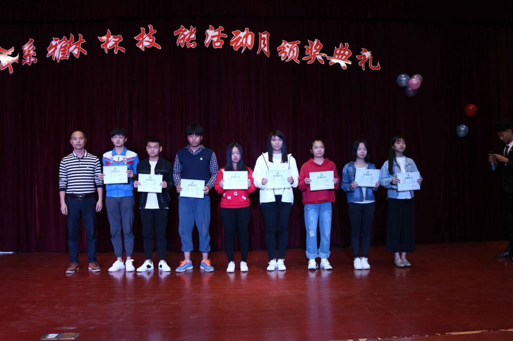 晚会穿插进行技能活动月的颁奖和游戏环节。第一轮颁奖由陈剑勇书记为“雅林杯”园林景观设计、园林景观施工及植物识别三个竞赛项目一等奖获奖者颁奖。