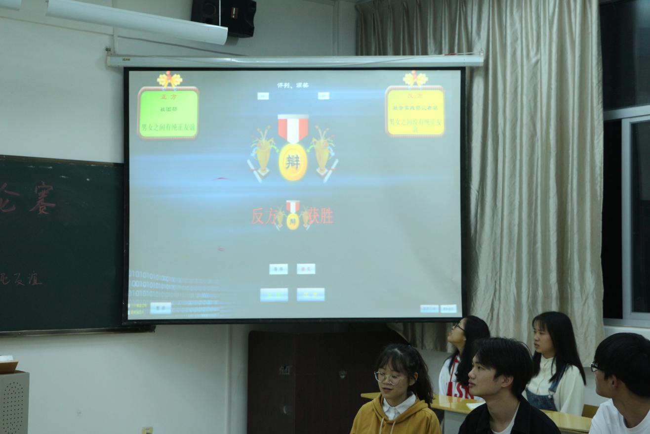 本次的辩题由抽签决定,由各部门的干部担任评委。比赛模式采取二进一的模式进行,最终评出第一名、第二名、第三名和最佳辩手。比赛流程共分为开篇立论、攻辩环节、自由攻辩、总结陈词四个环节。正方一辩和反方一辩首先代表自己的辨方立论,双方的论点都条理清晰,有理有据。辩驳环节,双方辩手针锋相对,唇枪舌剑,气氛变得紧张又激烈,双方你来我往,却又不失风度,侃侃而谈。尤其是在最精彩的自由辩论环节,现场气氛迅速升温,选手们都发挥了自己的才能,展现了他们良好的语言组织能力和应变能力。精彩不停,掌声不断。一场激战之后,双方四辩都对己方的观点进行了总结,而后宣布胜利的一方。
