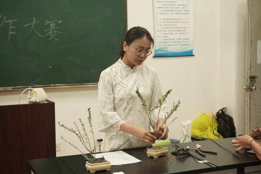 盆景美学,一盆植物,更是一种美学。在此次技能竞赛开展前,张称称老师对参赛的选手们进行了赛前培训,使其更好的了解此次竞赛的规程及要求。竞赛正式开始,选手们立即投入到紧张的制作当中。修剪、蟠扎、换盆……在短短的一小时内,看似普通的盆景素材经过选手们的巧手改造,变成了一件件精美的艺术品。