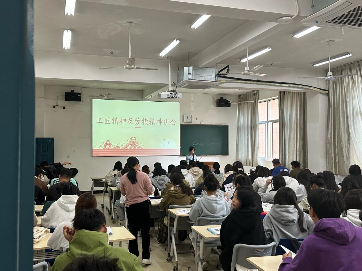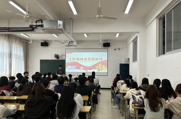班会上,各班班长结合视频、PPT等材料,向同学们介绍工匠精神以及劳模精神的时代背景、内涵。