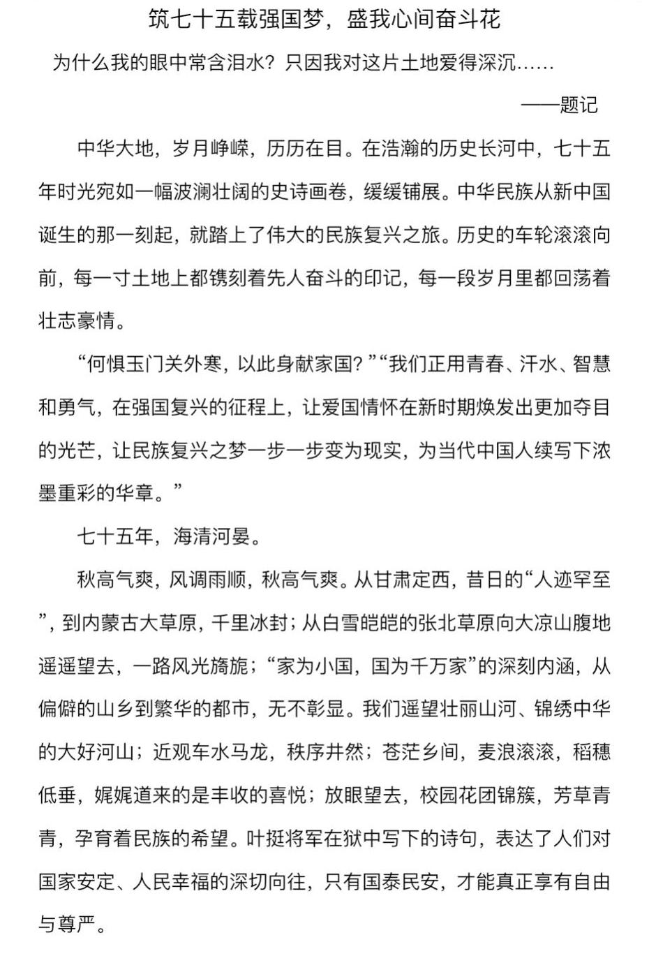 为庆祝中华人民共和国成立七十五周年,继承红色血脉,激发爱国热情。2024年12月园林系举办了一场以“强国复兴有我——庆祝新中国成立75周年”为主题的线上征文比赛。