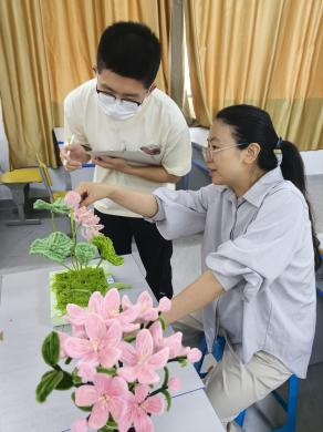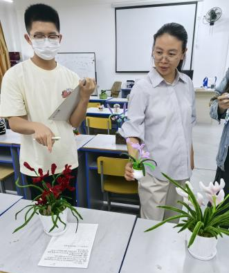 于5月27日星期二,参赛同学纷纷把作品带到园林楼进行评选。张称称老师时而凝神细察每一处细节,指尖轻触那些由柔软彩色扭扭棒精心塑成的枝干、叶片与“花朵”;时而低声讲述专业意见,探讨作品在造型设计、色彩搭配、空间布局上所展现的巧思与匠心,对每一件凝聚着学生心血的佳作进行细致入微的评估。
