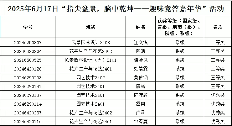 为响应国家“加强高校中华优秀传统文化教育”号召,推动盆景这一非遗艺术融入校园文化,2025年6月17日,园林系“指尖盆景 脑中乾坤——趣味竞答嘉年华”在园林楼顺利收官。活动通过趣味竞答形式,引导同学们深入了解盆景艺术的历史脉络、流派特色及文化内涵,有效打破“盆景=盆栽”的认知误区,为传统文化传承注入青春力量。
