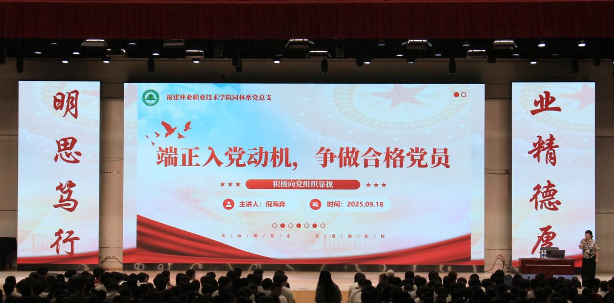 随后,倪海奔老师围绕“何为正确入党动机”“如何践行合格党员标准”两大核心问题展开讲解。他结合党的发展历程,深入浅出地剖析了正确入党动机的内涵,明确指出入党应是基于对党的信仰认同、对人民事业的责任担当,而非功利化追求。同时,他从“思想上求进步、学习上争优秀、实践中勇担当”三个维度,为新生指明了向合格党员看齐的努力方向,鼓励同学们将个人成长与国家发展、行业需求相结合,在园林专业领域践行初心使命。