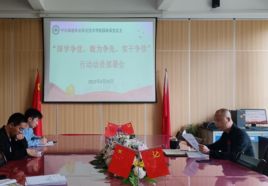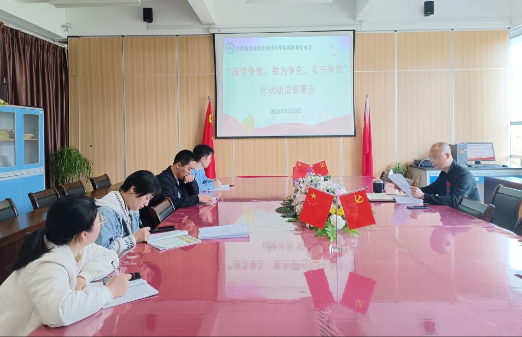 为贯彻落实党的二十大精神和省委“深学争优、敢为争先、实干争效”行动部署,4月10日上午,园林系党总支组织召开行动动员部署会。此次会议由园林系党总支书记陈剑勇主持,园林系领导班子及学生第一党支部书记倪海奔和学生第二党支部书记刘延君共同参与。