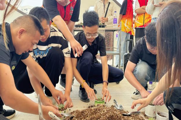 参观结束后,辅导员们进行了多肉盆栽植物栽植的劳动实践活动,本环节由戴曲顺老师讲解并示范多肉盆栽种植及养护常识。听完讲解后,大家挑选自己满意的多肉植物后,纷纷动手种植,将其栽植到精美的花盆中。栽植完成后,全体人员进行劳动成果展示。
