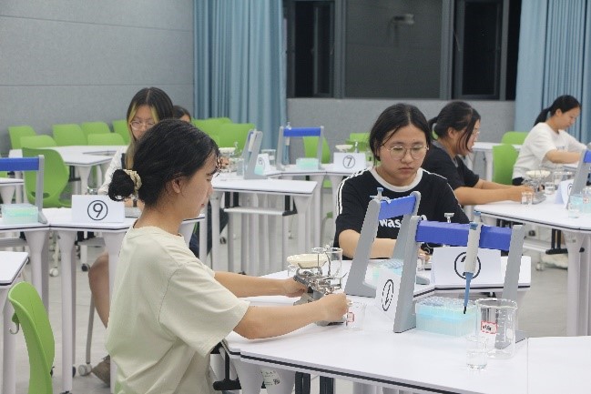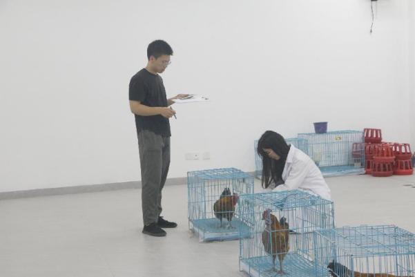 比赛内容包括动物疫病检疫检验理论知识考试和现场实操考核两个部分,注重实际操作和技能的考核,为参赛选手提供了良好的竞技舞台。比赛开始前,参赛选手依次到场进行签到。比赛开始,主持人宣读考试注意事项以及比赛规则,选手们先进行理论知识考试。为了确保赛事高效进行,理论考试结束后,选手们分为A、B两组进行操作考核,A组选手到园林楼603教室进行托盘天平的配平和96孔板的打板比赛,B组选手到园林楼606教室鸡的保定比赛,两组选手各自完成第一轮比赛后,互换比赛场地进行第二轮比赛。