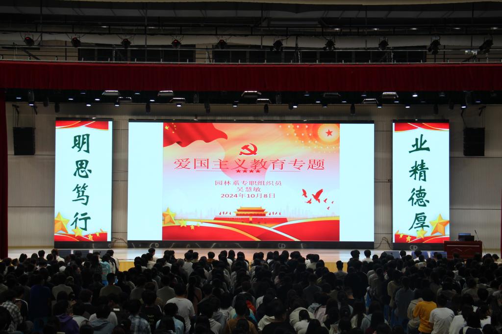 为增强爱国情怀,深化爱国理想信念教育,激发青年学生政治热情,引导青年大学生主动积极向党组织靠拢。2024年10月8日,园林系于江南校区体育馆开展“爱国主义教育”专题讲座。此次讲座由园林系专职组织员吴慧敏主讲,园林系2024级各班辅导员、助导及24级全体新生参与。