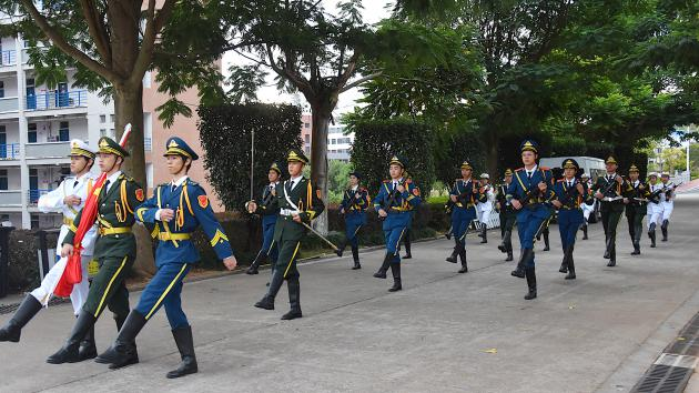 踏着铿锵有力的步伐,国旗护卫队护卫国旗到达升旗台;在雄壮激昂的国歌声中,五星红旗冉冉升起,在场师生庄严肃穆面向五星红旗行注目礼,齐唱国歌。
