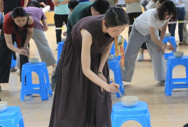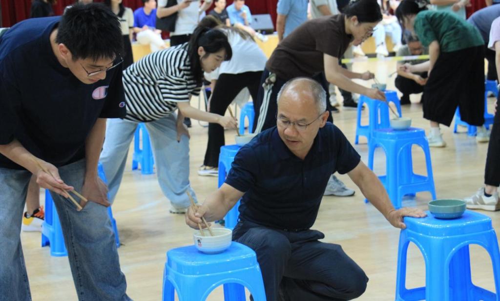 下午2时40分,各参赛队员准时于江南校区体育馆集合,简短的赛前动员后,夹乒乓球接力赛率先在体育馆一楼打响。比赛现场,队员们手持筷子,神情专注,小心翼翼地将乒乓球依次传递,力求精准地将球放入队友碗中,大家全神贯注比拼传递个数,现场气氛紧张而热烈,不时传出阵阵欢笑与加油声。随着接力赛的结束,参赛队员们迅速移步足球场,开启足球点球大战环节。每位参赛队员拥有5次射门机会,只要将球踢入指定区域内便算有效得分。赛场上,平日里温文尔雅的老师们化身绿茵场上的运动健将,摩拳擦掌、各展球技,时而大力抽射,展现出强劲的爆发力;时而巧妙推射,彰显出细腻的脚法,精彩瞬间不断上演,欢呼声此起彼伏。