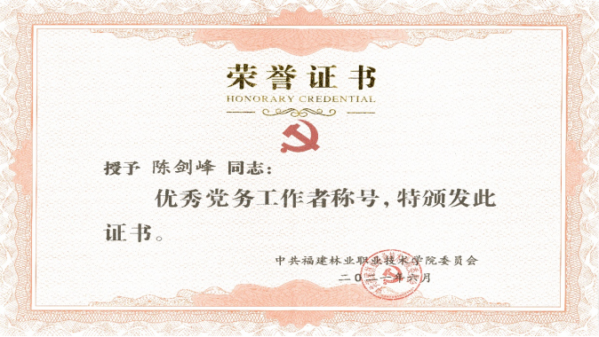 2015年担任园林系党总支组织委员以来,他把对党的热情积极投身到工作当中,2016年7月,被评为“学院优秀共产党党员”,2021年6月,被评为“学院优秀党务工作者”得到了党组织的充分认可。