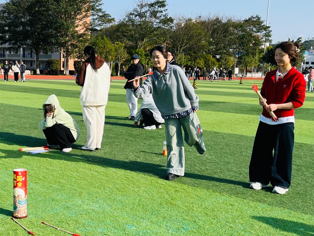 “投壶竞技?百步穿杨”项目中,参赛小组的两位同学站在指定距离外,专注地投出手中的箭矢。每一次投出,都承载着小组的希望,大家屏气凝神,期待着箭矢能精准落入壶中。赛场上,欢呼声与叹息声交织,同学们为每一次精彩的投中欢呼,也为稍有偏差的尝试感到惋惜。