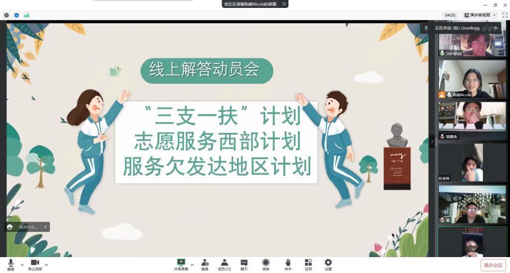 会议中,老师们详细讲解了“三支一扶”、“西部计划”、“服务欠发达地区”计划的背景、意义、报考流程、待遇与发展等相关政策内容,并详细地向同学们分析了历年的招聘情况和政策,提醒应届毕业生如何更好地准备和竞聘,鼓励我系学生积极参与、奉献青春、投身基层。最后,老师们耐心地解答毕业生们提出的问题,为同学们答疑解惑。