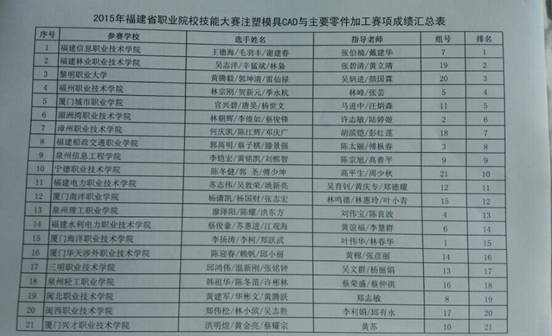 2015年福建省职业院校技能大赛(高职组)“注塑模具CAD与主要零件加工”赛项于4日2日在福建信息职业技术学院举行。本项次竞赛全省共有21支代表队参赛,自动化工程系选派的吴志洋、辛猛斌、林枭等3位同学组成的代表队,在张碧清、黄立靖老师的帅领下,经过三维建、模具设计、数控编程、数控加工等环节,历经2天时间的奋力比拼,在高手如云的参赛队中,不负众望,脱颖而出,获得团体第二名(一等奖)的优异成绩。在此我们向参加比赛的选手和指导教师表示热烈祝贺!