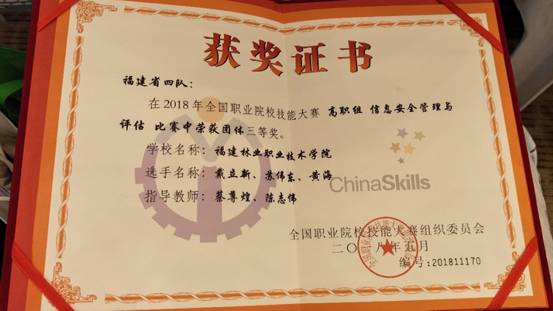 2018年5月29日,自动化工程系学生在蔡尊煌、陈志伟两位老师的率领下参加2018年全国职业院校技能大赛高职组“信息安全管理与评估”赛项,斩获三等奖。