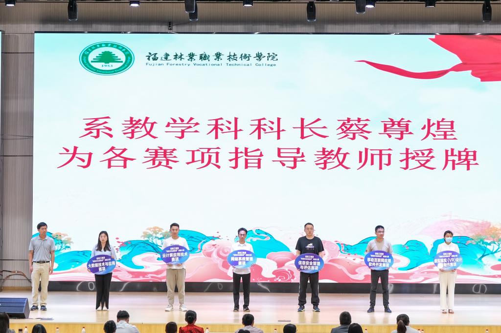 接着,系教学科科长蔡尊煌老师为虚拟现实(VR)设计与制作、移动互联网应用软件开发、信息安全管理与评估、网络系统管理、云计算应用技术、大数据技术与应用各赛项指导教师授牌。
