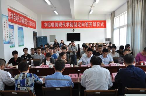 中铝瑞闽股份有限公司副总经理蔡峰、院长郑郁善、院党委副书记陈洪尧、华闽南配股份有限公司总工程师张平山、中铝瑞闽人力资源部经理陈仕武,华闽南配副总工程师曹明闽、人力资源部经理刘丽萍、自动化工程系主任谢金生以及全体中铝瑞闽现代学徒制定向培养班学员参加了开班仪式。
