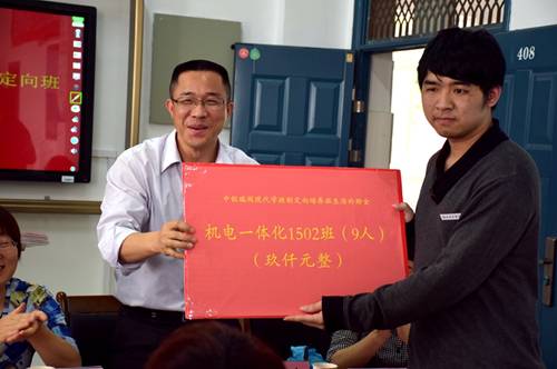 机制1512班张成杰同学代表全体定向班同学进行发言,他表示学员们定将珍惜此次学院与中铝瑞闽公司为大家提供的定向培养机会,认真学习、勤于实践、自觉磨砺,掌握过硬的专业技术,适应企业发展需要,出色完成本职工作,更好地服务社会、报效母校。