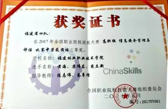 5月16日-5月18日,2017年全国职业院校技能大赛高职组“信息安全管理与评估”项目在福建信息职业技术学院举行。我系选派的黄海、苏伟东、戴立新3位同学组成的代表队,在陈志伟、蔡尊煌两位老师的指导带领下,历经3天时间的激烈角逐,在高手如云的参赛队中,不负众望,脱颖而出,荣获大赛三等奖。在此,我们向参加比赛的选手和指导教师表示热烈祝贺!