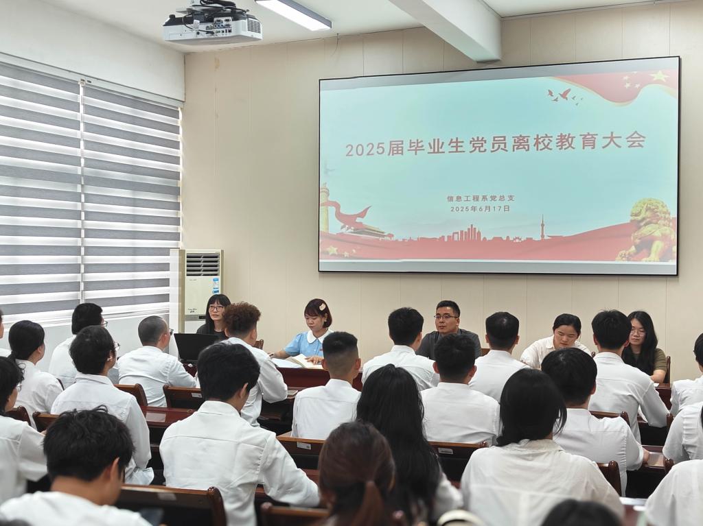 为强化毕业生党员党性教育,引导其在新征程中永葆党员本色,信息工程系于2025年6月17日下午在信工楼408会议室召开毕业生党员离校教育会议。信息工程系党总支书记、主任华建祥、副书记叶文美、组织员谢婉欣、学生第一党支部书记郑燕丽、学生第二党支部书记陈雅佳、专业带头人谢洁杰、陈志伟、余慧婷、陈小芳老师及38名毕业生党员参会。