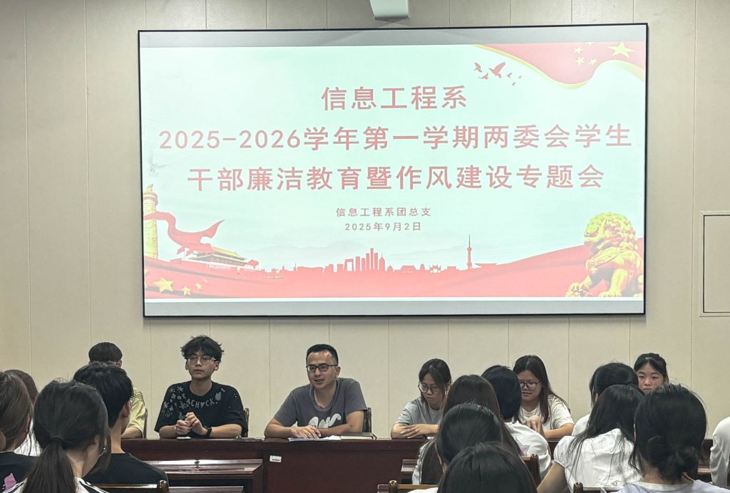 为进一步加强学生干部队伍建设,提高学生干部的廉洁意识、责任意识和服务意识,营造风清气正的校园环境,同时明确新学期两委会各部门工作任务、职责边界与执行要求,信息工程系于2025年9月2日18:30在信工楼408会议室召开2025-2026学年第一学期两委会学生干部廉洁教育暨作风建设专题会。本次会议由学生科长兼团总支书记吴文杰主持,系两委会全体学生干部参会。