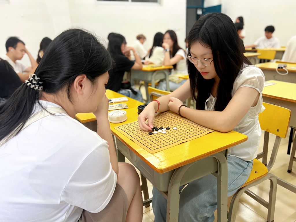 随着赛事负责人宣布“比赛开始”,原本热闹的教室迅速切换至“专注模式”:选手们或两两对坐,在双人对局中展开一对一的思维较量;或三五成组,在团体对弈里磨合协作策略。棋盘上,黑子落定如稳扎营盘,白子穿插似巧破阵局,清脆的“嗒嗒”落子声成为赛场的主旋律。有的选手托腮凝思,指尖在棋盘边缘轻叩,反复推演多种走法;有的选手果断出击,以一步“冲四活三”的妙棋扭转局势;旁观的同学也屏息凝神,在不打扰对局的前提下,默默为选手的精彩思路点头称赞。整场比赛节奏紧凑却秩序井然,每一局对弈都充满策略与趣味的碰撞,尽显青春学子的思辨活力。