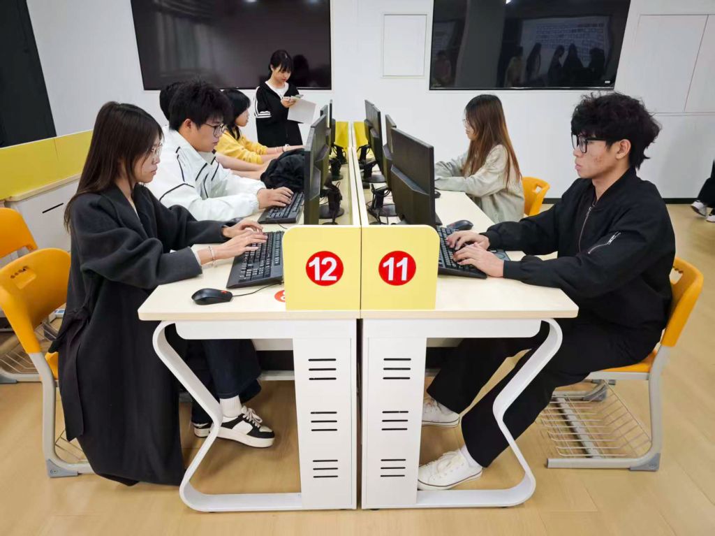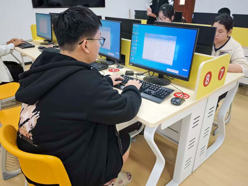 机房内,紧张的氛围扑面而来。随着倒计时结束,比赛正式开始,噼里啪啦的键盘敲击声瞬间汇成激昂的节奏,《祖国啊,我亲爱的祖国》的诗句随着指尖跳跃逐行浮现。后台专业软件以毫秒级精度实时抓取打字速度与正确率,左侧实时排行榜像电竞比分板般不断刷新,每一次排名反超都激起现场同学的低声惊呼,让竞技氛围持续升温。