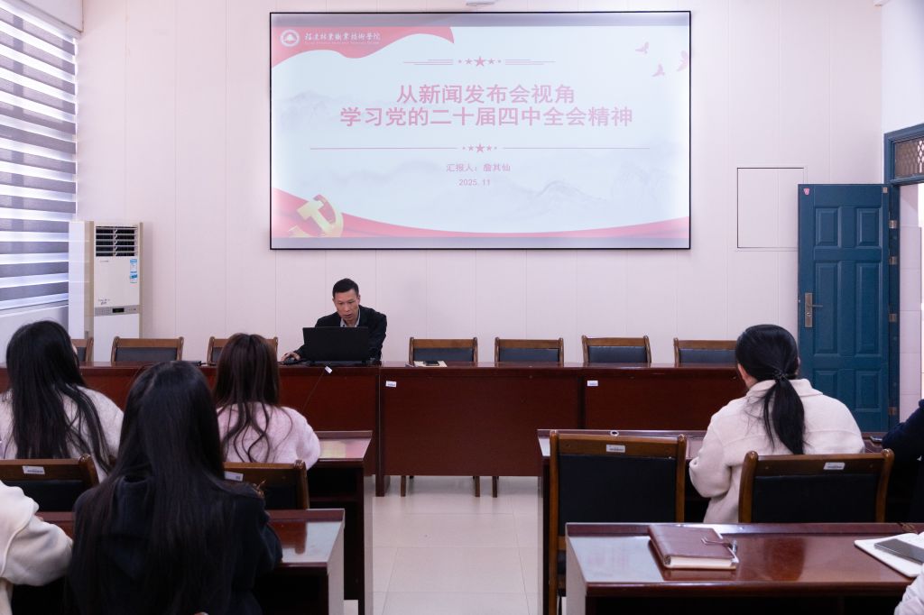 2025年11月20日下午,学院纪委书记詹其仙以“从新闻发布会视角学习党的二十届四中全会精神”为题作专题党课宣讲,院纪委办公室支部党员,信息工程系全体教师党员和大数据2401班学生共同参与此次学习。