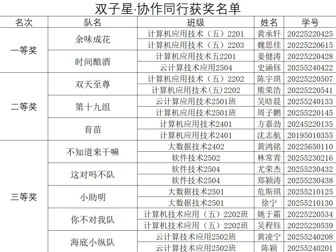 整场活动中,参赛学子热情高涨、全力以赴,赛道上的奋力拼搏与场边的加油呐喊交织成青春乐章,充分展现了信工学子阳光向上、团结协作的精神风貌。经过多轮激烈比拼,主办方根据各环节总体完成时间评选出优胜队伍,具体获奖名单如下:
