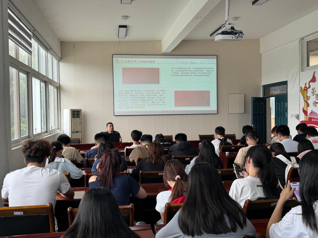 2025年6月20日,信息工程系党总支书记、主任华建祥,在信工楼408会议室为计算机应用技术2401班的全体学生上了一堂生动的形势与政策课。本次课程以“青年学生要做中央八项规定精神的坚实践行者”为主题,旨在引导学生深刻理解中央八项规定精神,积极践行廉洁自律,为未来的成长和发展奠定坚实基础。