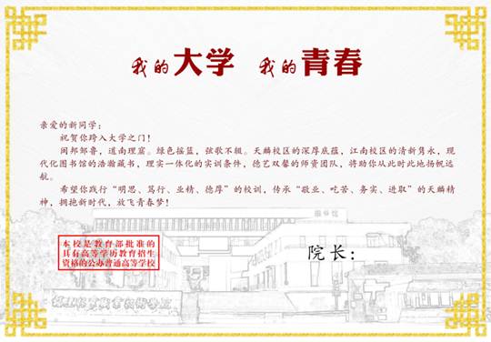 ☆院长以《我的大学 我的青春》为题,写了一封简洁的“励志信”,简要介绍学院办学实力的同时,鼓励全体新同学要“拥抱新时代,放飞青春梦”,激发新同学对未来大学生的的期待和憧憬!