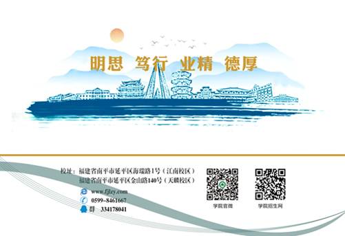 ☆封底图画是学院所在地南平市的LOGO缩略图,南平的标志性建筑和碧波荡漾的延平湖水,兼有红日照耀和鸿雁飞翔,体现南平是一座“山水相融、城景相依、人与自然和谐相处”水美城市,也象征南平正扬帆远航、蒸蒸日上。